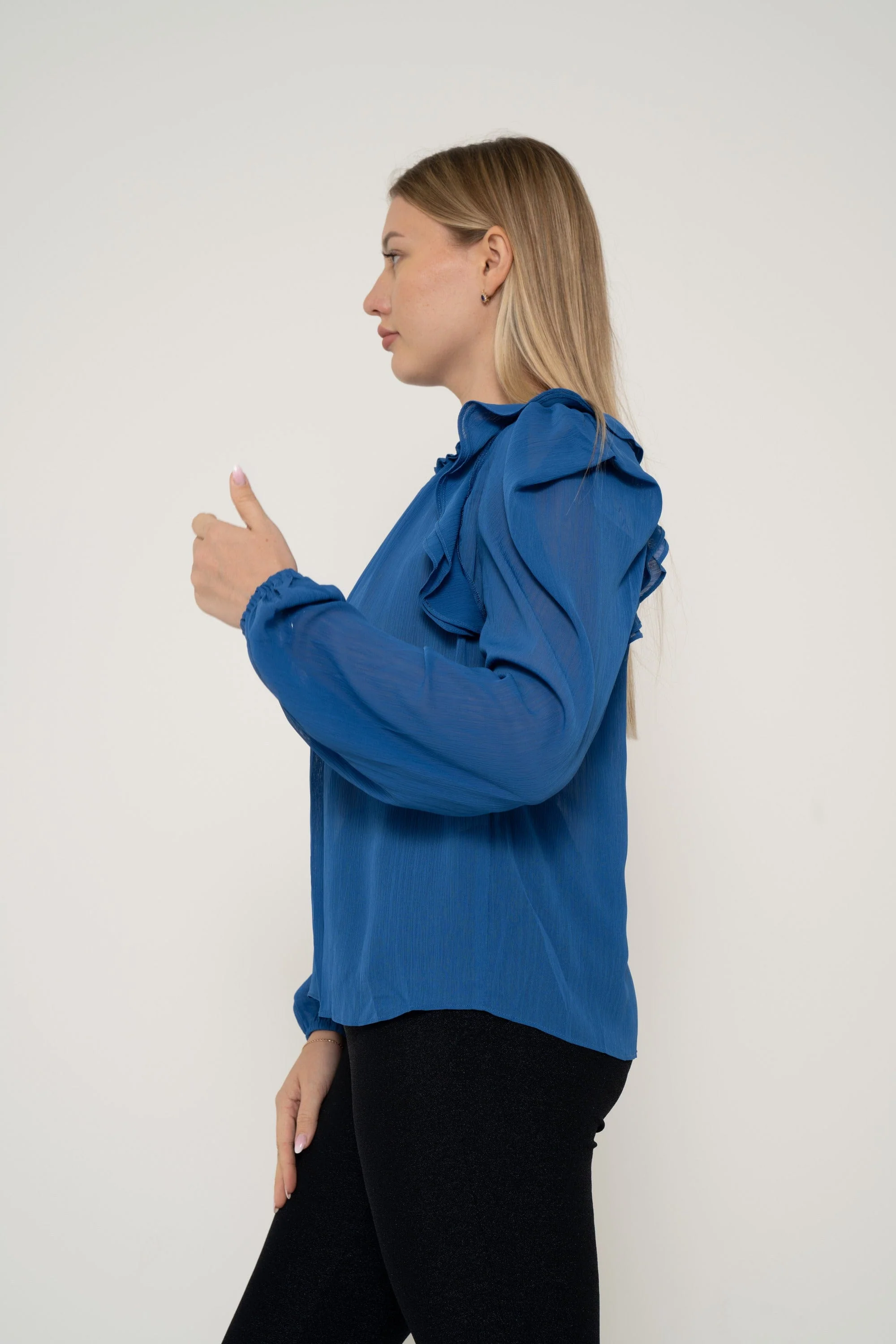 Plain Chiffon Blouse With Ruffled Shoulder And Long Sleeves